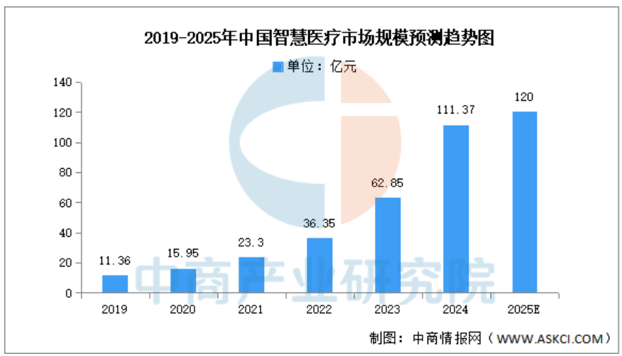 跟着聪慧医疗手艺前进以及政策支撑,中国聪慧医疗市场规模不竭扩大且增加敏捷。演讲显示,2023年中国聪慧医疗行业市场规模达62。85亿元,2019-2023年年均复合增加率达53。37%,2024年约为111。37亿元,估计2025年将增至120亿元。