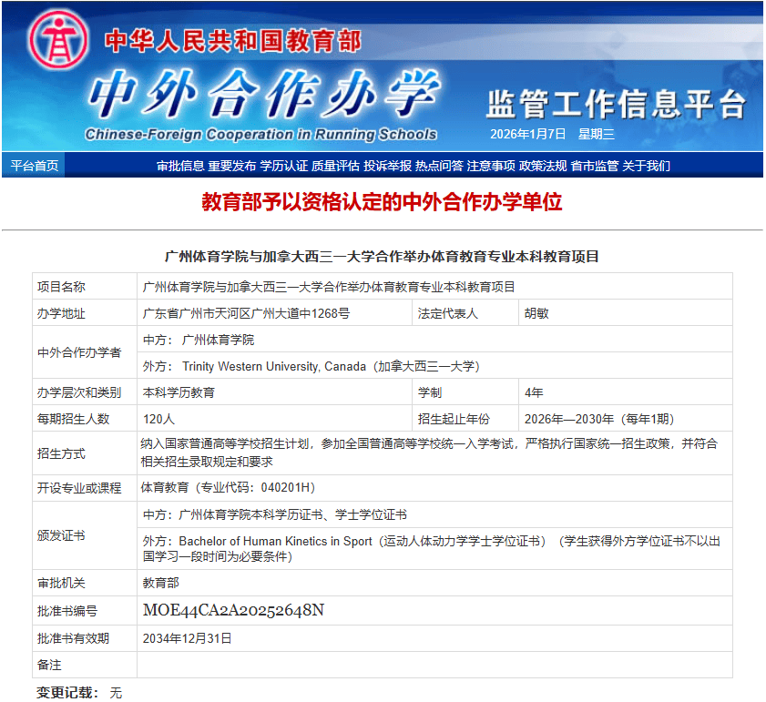 本次获批的中外合做办学项目聚焦体育教育专业(专业代码040201H),学制4年,每期招生120人,将从2026年起起头招生。项目严酷纳入国度通俗高档学校招生打算,考生需加入全国通俗高档学校同一入学测验,施行国度同一招生政策。正在培育系统上,项目融合中加两边办学劣势:学生完成四年学业后,将同时获得广州体育学院本科学历证书、学士学位证书,以及西三一大动听体动力学学士学位证书(Bachelor of Human Kinetics in Sport),且外方学位获取不设出国进修强制前提,为学生供给了“本土攻读、国际认证”的优良教育径。