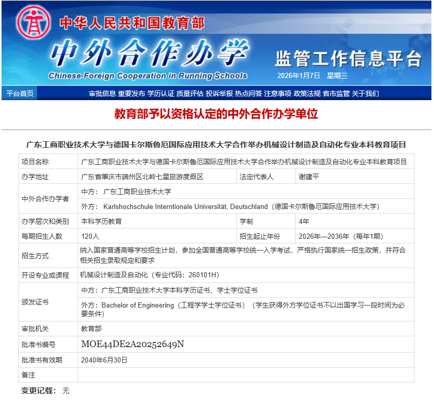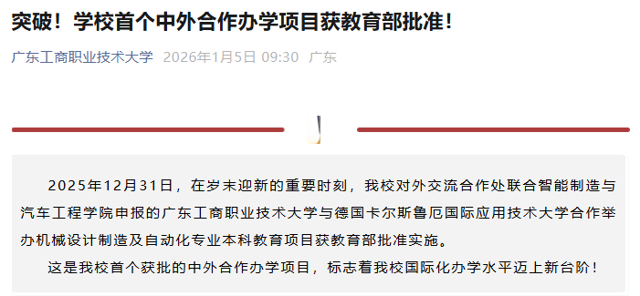 2025年12月31日,广东工商职业手艺大学取卡尔斯鲁厄国际使用手艺大学合做举办机械设想制制及从动化专业本科教育项目获教育部核准实施。这是学校首个获批的中外合做办学项目,标记着我校国际化办学程度迈上新台阶!