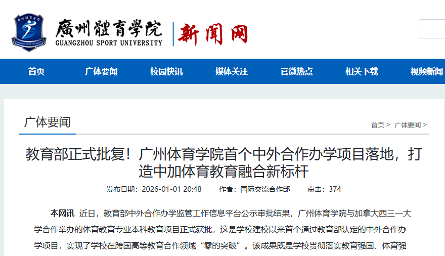 广州体育学院取西三一大学合做举办的体育教育专业本科教育项目正式获批,这是学校建校以来首个通过教育部认定的中外合做办学项目,实现了学校正在跨国高档教育合做范畴“零的冲破”。