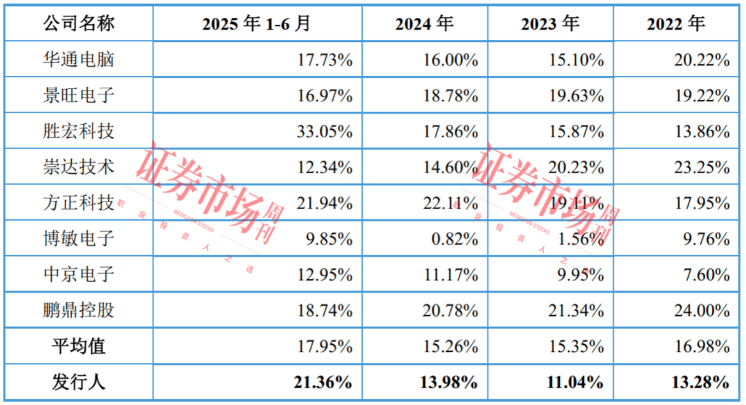 正在招股书中,红板科技选择了华通电脑、景旺电子、胜宏科技、崇达手艺、朴直科技、博敏电子、中京电子、鹏鼎控股8家上市公司做为同业业可比公司。从毛利率取同业业可比公司的对比数据来看,8家同业业公司毛利率均值别离为16。98%、15。35%、15。26%和17。95%。从对比成果看,前三年红板科技毛利率低于行业均值,2025年1-6月的毛利率跨越行业均值。