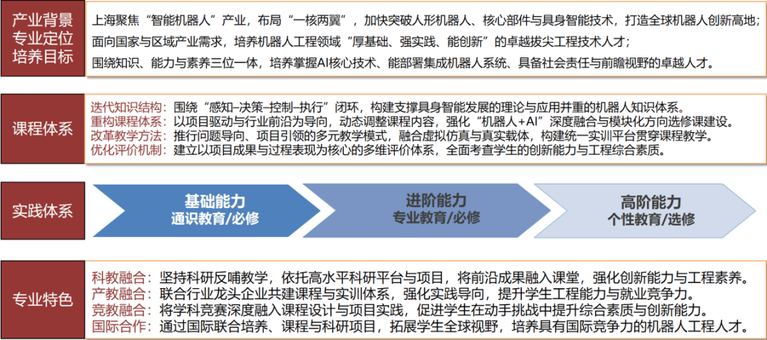 机械人工程专业修学年限四年,达到上海大学学位授予要求的,授予工学学士学位,可继续攻读机械工程、从动化、节制科学、人工智能等相关学科的硕士或博士学位。机械人专业目前已引进兼任教师66名,此中国度级/省部级高端人才10人次,传授20人,副传授23人。同时,专业联聘优良企业导师多名。兼任教师中,博士学位师资100%,大多具有海外学位、工做或者访学履历。环绕机械人、AI和具身智能深度融合的人才培育方针,构成了明显的“科教融合、产教融合、竞教融合、国际合做”四位一体的培育模式:科教融合:“传授100%为本科生讲课,科研团队100%组建讲授团队”,将前沿研究融入讲堂讲授。依托上海市智能制制取机械人沉点尝试室、宝山-宇树-上海大学通用机械人研究院等平台,连系智能机械人、人形机械人、具身智能等标的目的的国度及省部级科研项目,通过教师科研项目对课程扶植、学生培育无效赋能,鞭策学生正在进修中接触实正在科学问题,培育立异思维取工程素养。产教融合:积极取安川电机、发那科、ABB、卡尔蔡司、新松机械人、宝山-宇树-上海大学通用机械人研究院等机械人范畴企业合做,共建课程系统取实训平台,由学校和企业结合制定高年级练习和结业设想课题,成立校企反馈机制,确保学生具备面向将来财产的工程实践取立异能力,提拔就业合作力取行业顺应性。竞教融合:将学科竞赛取立异项目全面融入人才培育过程,确保本科生100%正在校期间完整参取、科研取工程项目。通过正在《机械人机械布局设想》、《机械人软件设想》、《智能机械人系统设想》等课程设想中融合学科竞赛项目内容,指导学生正在脱手中理解理论,正在挑和中提拔分析本质。国际合做:依托上海市沉点尝试室、引智、高程度国际科研合做平台,积极开展多模式、多条理的国际化人才培育。取美国普渡大学、亚琛工业大学、新加坡国立大学,开展3+1+1项目、暑期短期项目以及结业设想项目等结合培育。通过国际结合课程、海外访学项目、国际科研竞赛等体例,拓展学生的全球视野。培育可以或许正在国际科技合作中胜出的立异型、复合型机械人工程人才。依托上海大学国度“机械工程”一流学科、国度级工程锻炼核心、上海市智能制制及机械人沉点尝试室、上海机械人研究所、上海宝山上大通用智能机械人研究院、国度处所共建人形机械人立异核心“上海大学人形机械人结合立异核心”等平台;近年来正在机械人范畴取得凸起科研,人形机械人、仿巧手、农业机械人、救援机械人、四脚机械人、医疗机械人等。同时依托机电工程取从动化学院的分析劣势,取国表里出名机械人企业共建产教融合协同育人,建立“专业根本学问进修—手艺攻关—场景验证—分析能力提拔”的全链条培育系统,为学生供给丰硕的尝试、实训取项目实践机遇。建立“讲授—科研—财产”协同育人平台,支持学生从根本锻炼工程实和。